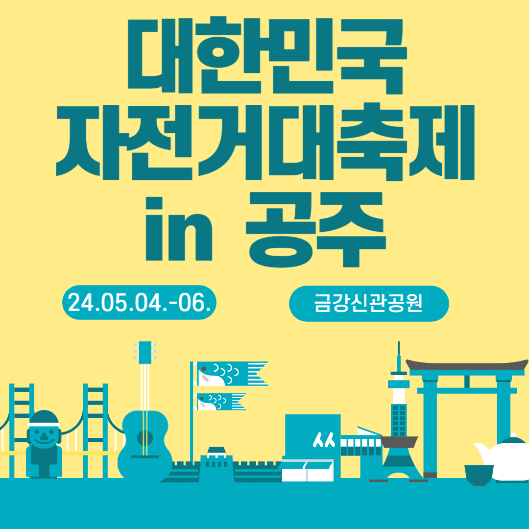 행정안전부와 공주시가 함께 '2024 대한민국 자전거대축제 in 공주' 행사를 5월 4일부터 5월 6일까지 금강신관공원 일원에서 개최합니다. 백제 그란폰도, 자전거대행진 등의 라이딩 프로그램과 자전거 관련 체험프로그램, 낙화 불꽃놀이 등 다채로운 행사가 준비되어 있습니다. 바로마켓 장터와 함께 푸드트럭 등의 먹거리장터와 함께 운영됩니다. 가족들과 함께하는 어린이날 나들이로 공주는 어떠신가요?